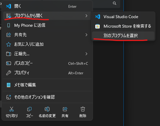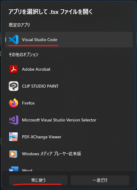 3.出てきたダイアログから開きたいアプリ(ここではVSCode)を選択して、「常に使う」をクリック